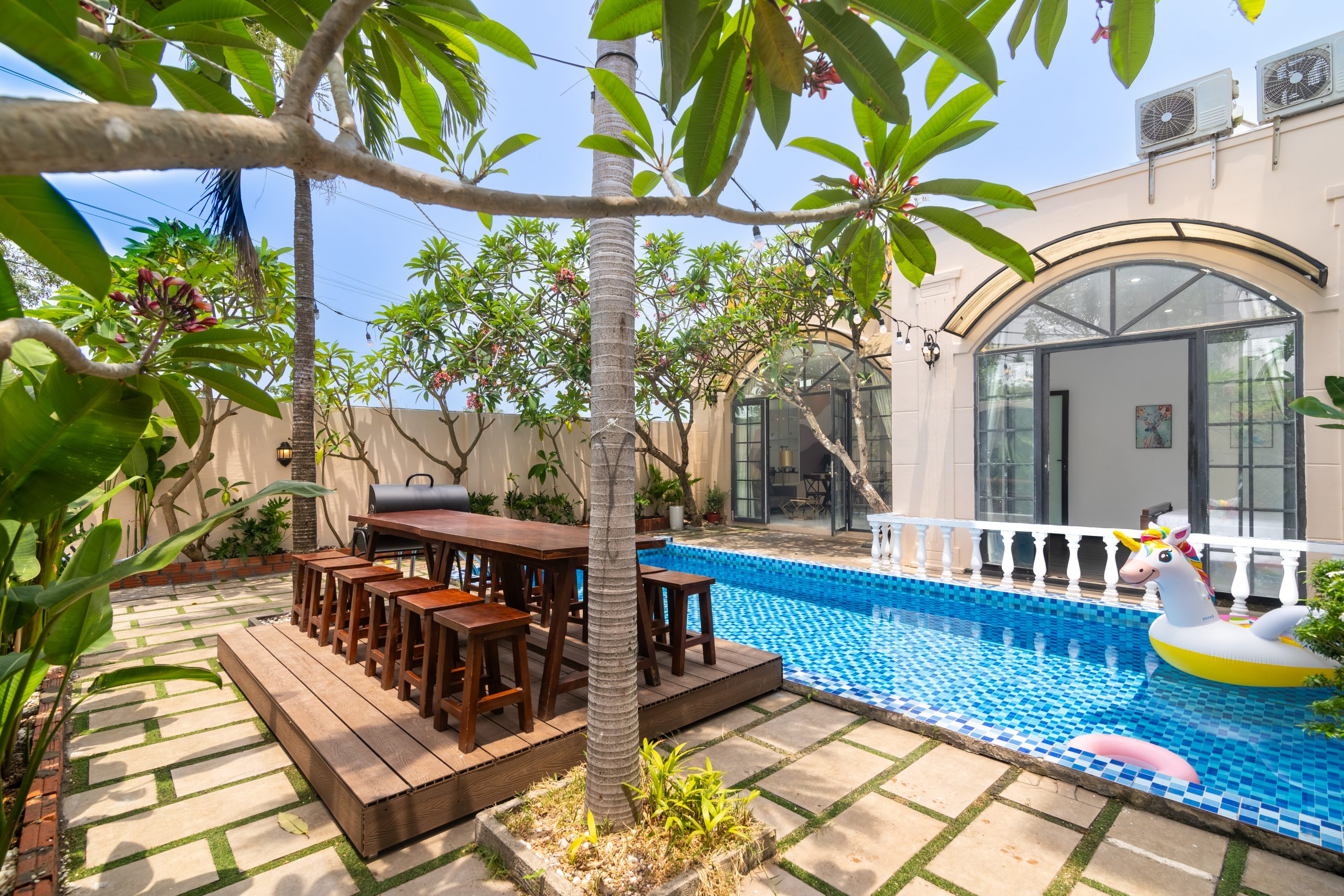 Discover your ideal getaway or long-term retreat in Da Nang. This spacious 4-bedroom private villa is located in Nam Viet A – a peaceful, expat-friendly neighborhood just 7 minutes by motorbike to the stunning My Khe Beach. With a private swimming pool, garden, and bright, fully furnished living spaces, this villa offers everything guests need to relax, work remotely, or enjoy time with family and friends. Each bedroom comes with a queen-size bed – providing maximum privacy and comfort for every guest. There's a designated work area with a desk and fast Wi-Fi, making it suitable for digital nomads and long-term visitors.